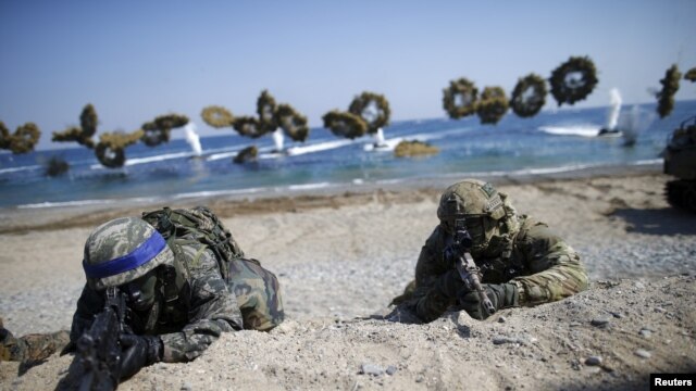 Tahunan AS dan Korea Selatan latihan berlangsung delapan minggu dan cermat direncanakan. kegiatan Sabtu mulai dengan AS dan pasukan Korea Selatan di kendaraan serbu menyerbu pantai di pantai timur Korea Selatan.